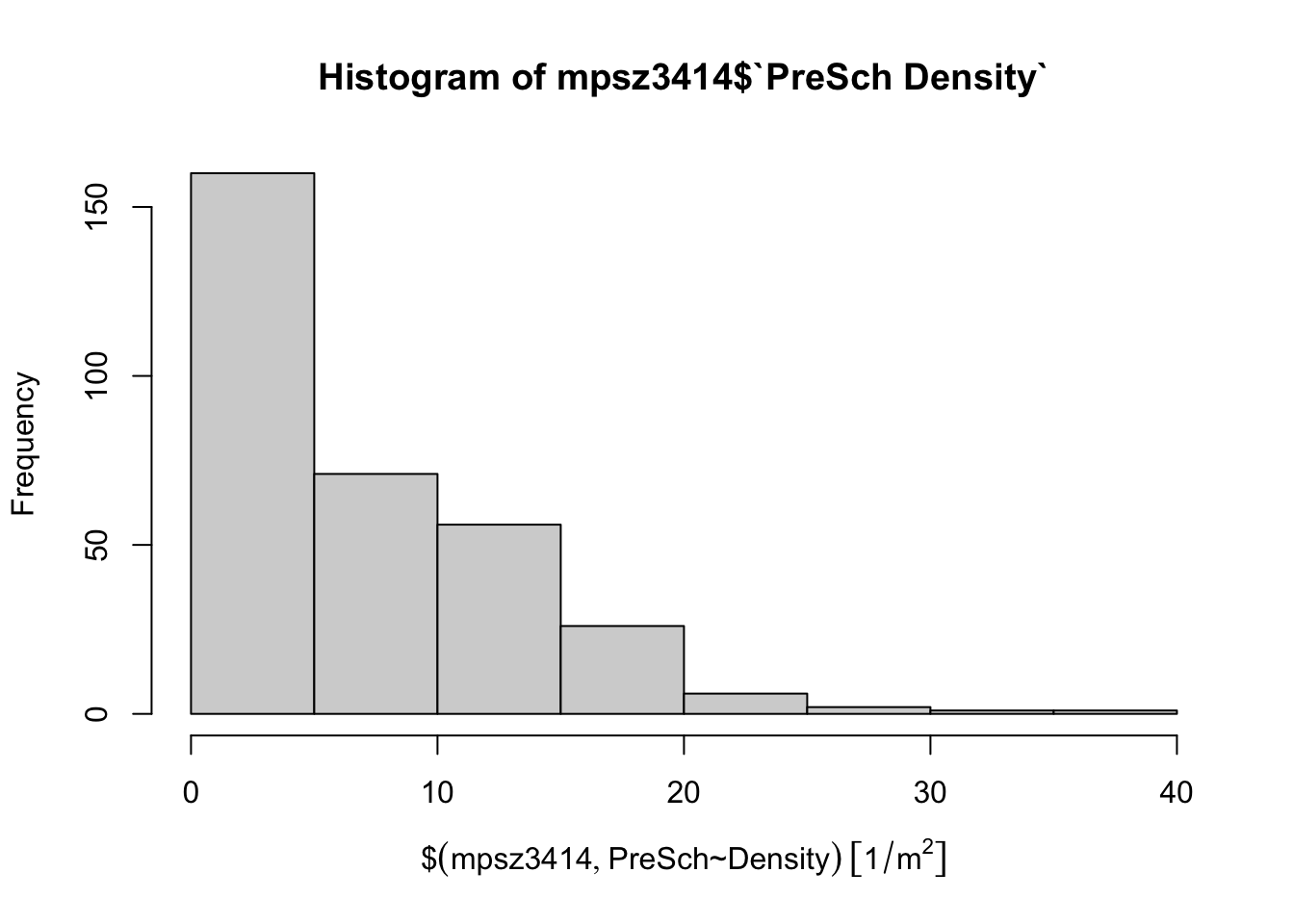 mutate(`PreSch Density` = `PreSch Count`/Area * 1000000)hist(mpsz3414$`PreSch Density`)