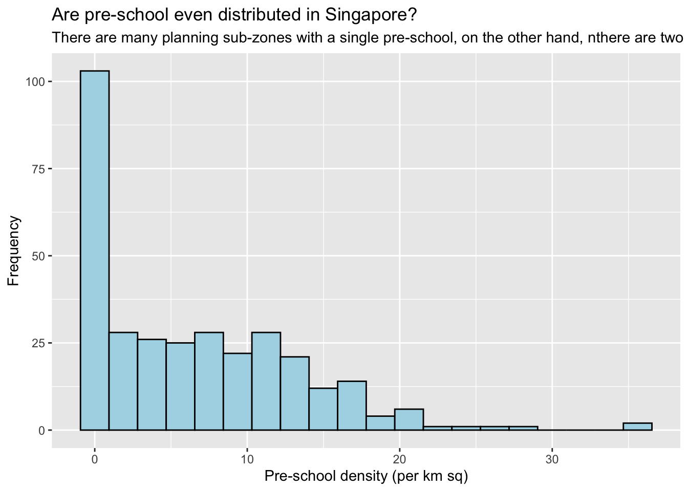 ggplot(data=mpsz3414, aes(x= as.numeric(`PreSch Density`)))+ geom_histogram(bins=20, color="black", fill="light blue") + labs(title = "Are pre-school even distributed in Singapore?", subtitle= "There are many planning sub-zones with a single pre-school, on the other hand, nthere are two planning sub-zones with at least 20 pre-schools", x = "Pre-school density (per km sq)", y = "Frequency")
