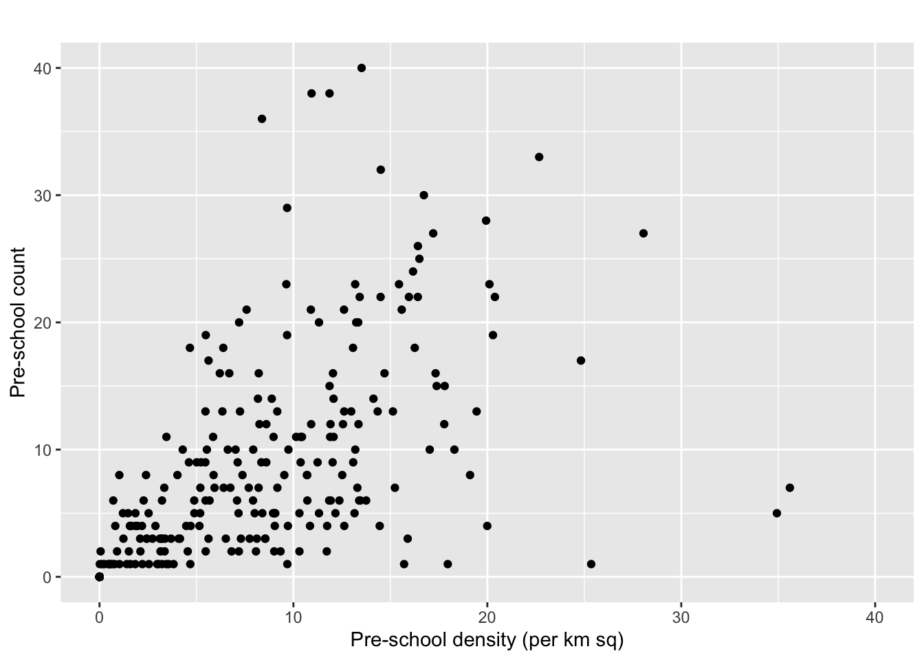 y = "Pre-school count")Warning: Removed 2 rows containing missing values (`geom_point()`).