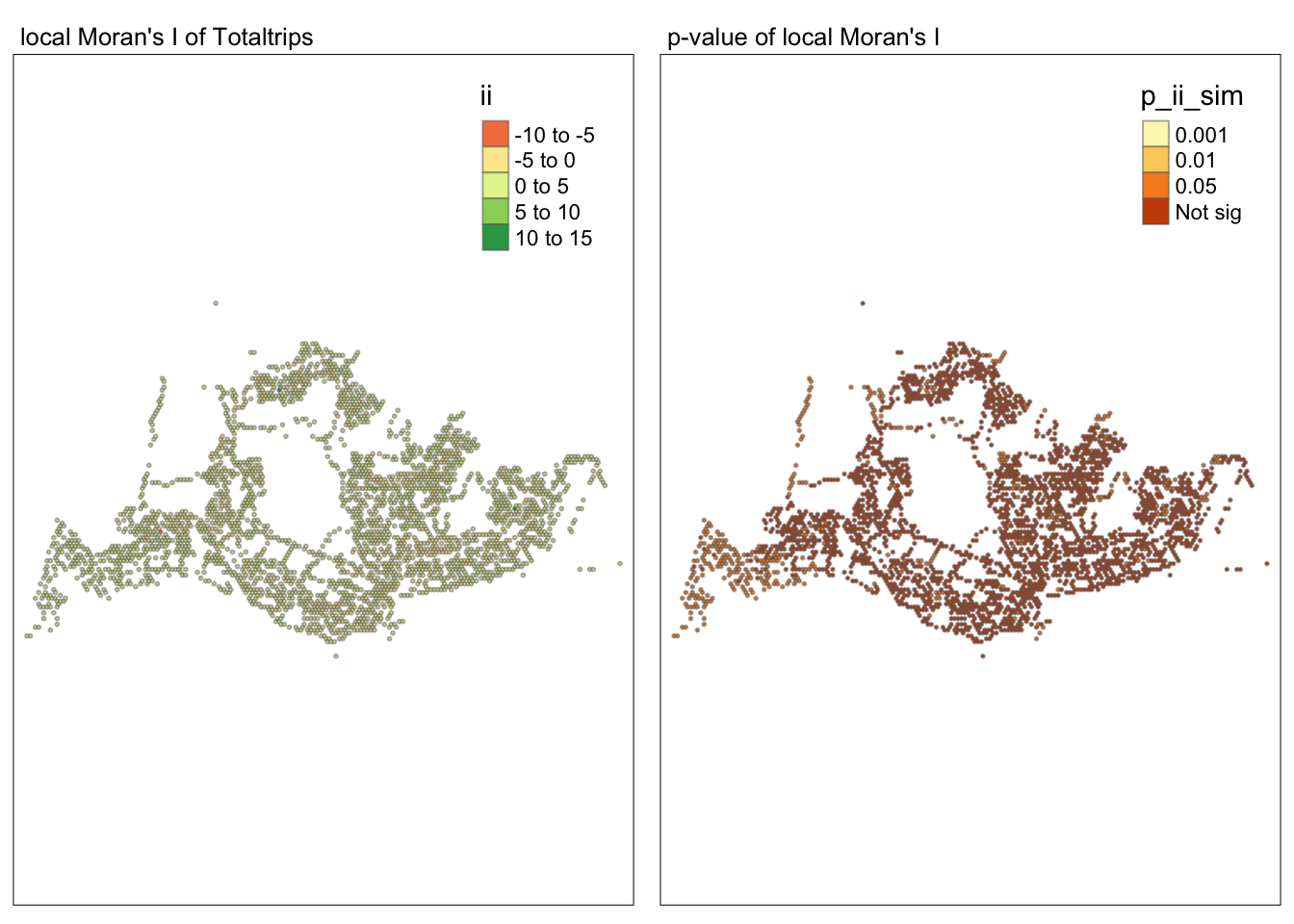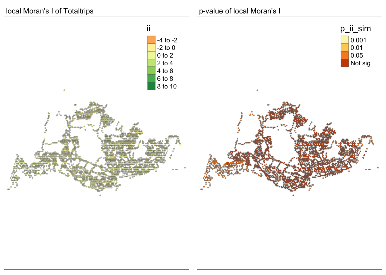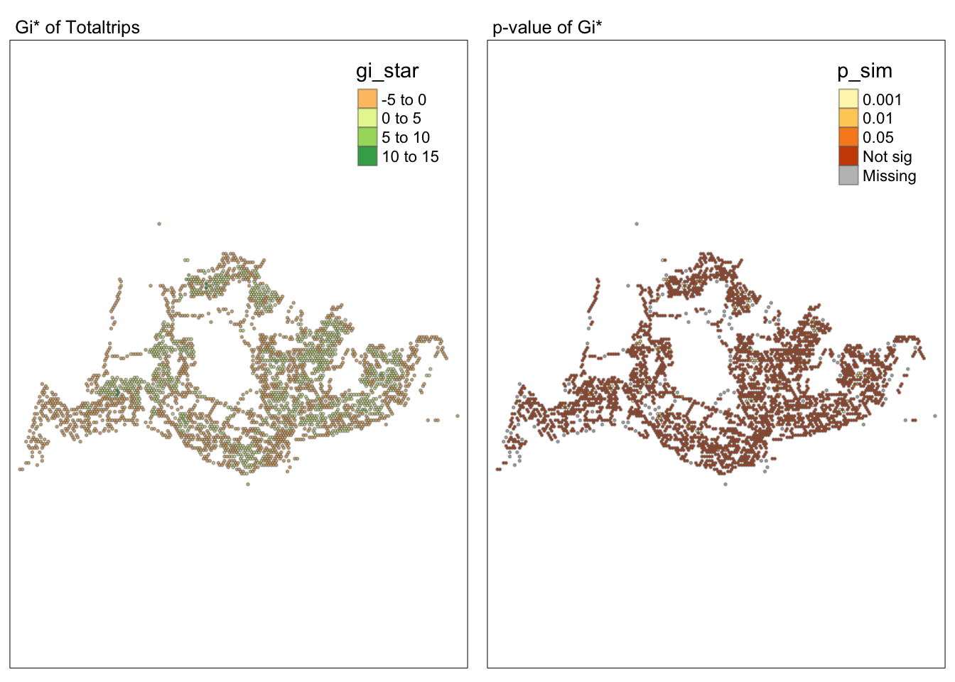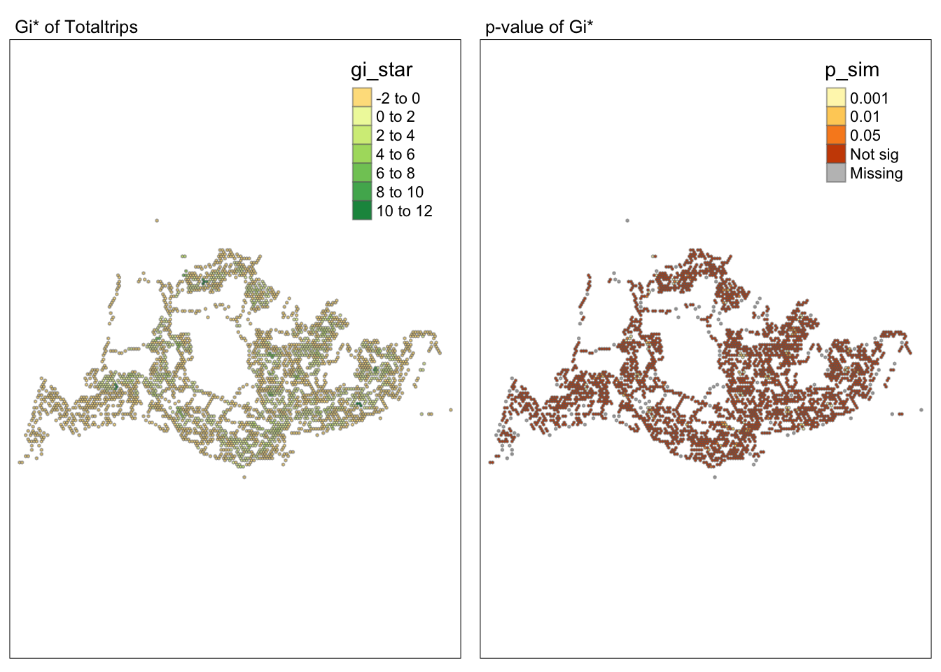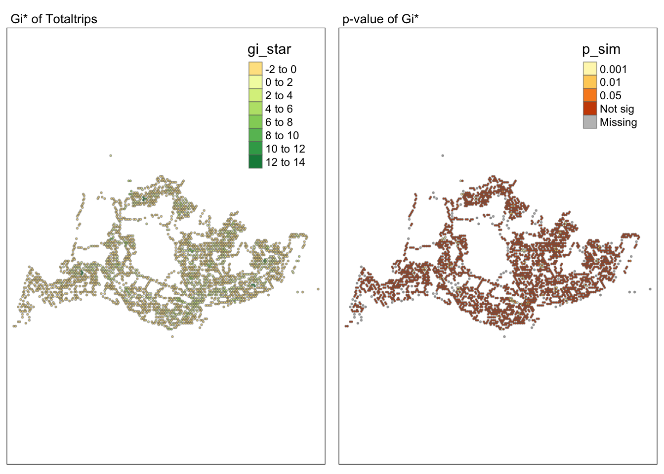 tmap_arrange(map1, map2, ncol = 2)Variable(s) "gi_star" contains positive and negative values, so midpoint is set to 0. Set midpoint = NA to show the full spectrum of the color palette.