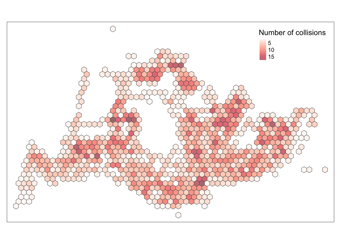 honeycomb_count = filter(honeycomb_grid_sf, n_colli > 0)write_rds(honeycomb_count, "data/rds/honeycomb_count.rds")map_honeycomb = tm_shape(honeycomb_count) +